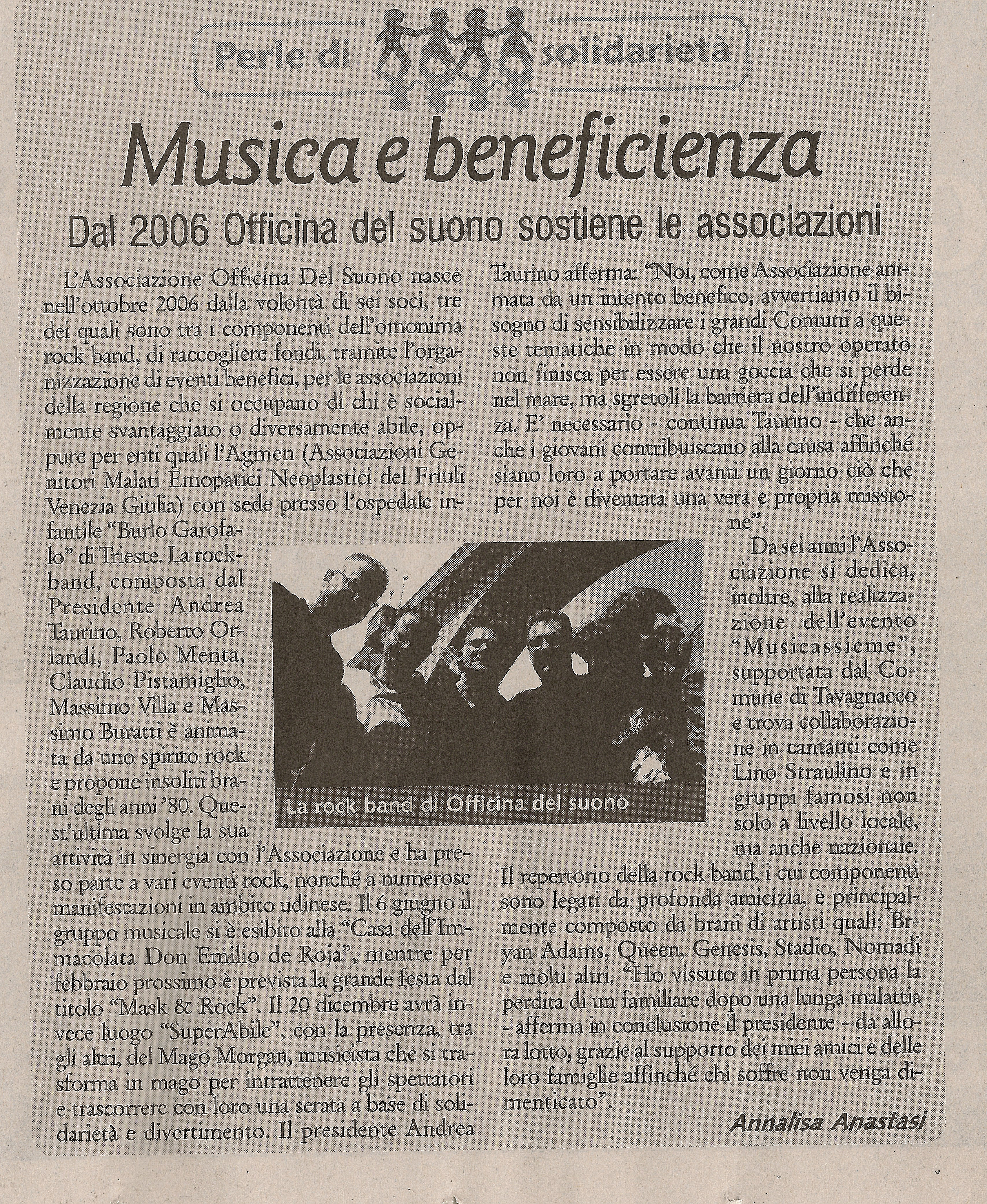 A sostegno di tale progetto ho voluto far intervenire “L'Associazione senza scopo di lucro Officina Del Suono” di cui sono vice-presidente che è nata principalmente come organizzazione per raccogliere e devolvere fondi a favore di chi è socialmente svantaggiato o diversamente abile. Ho sensibilizzato il presidente Andrea Taurino che già si adopera per altre attività simili nel territorio regionale prima fra tutti “MUSICASSIEME” in collaborazione con il Comune di Tavagnacco evento oramai storico in Regione. L'associazione è per noi un solido punto di riferimento, una vera e propria ‘officina’ dove organizzare, progettare, collaudare e mettere in strada quante più attività possibili per la raccolta di fondi a favore delle persone più bisognose”.