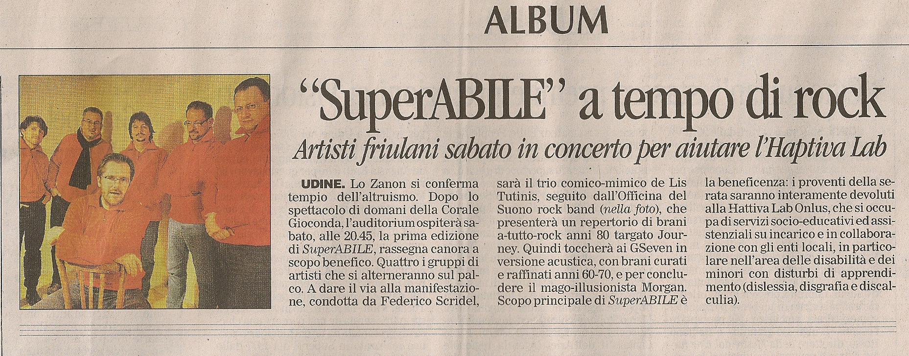 Si svolgerà sabato 20 Dicembre nell’ auditorium Zanon di Udine a partire dalle 20.45 la 1^ edizione di SuperABILE, la rassegna canora a scopo benefico i cui proventi della serata saranno interamente devoluti alla Hattiva Lab Onlus una cooperativa sociale che si occupa di servizi socio - educativi ed assistenziali su incarico e in collaborazione con gli enti locali, in particolare nell’area delle disabilità e dei minori con disturbi di apprendimento (dislessia, disgrafia, discalculia). Sarà uan serata all’insegna del divertimento, del ritmo e della beneficenza con quattro gruppi di artisti che si alterneranno sul palco di SuperABILE per due ore di travolgente spettacolo.