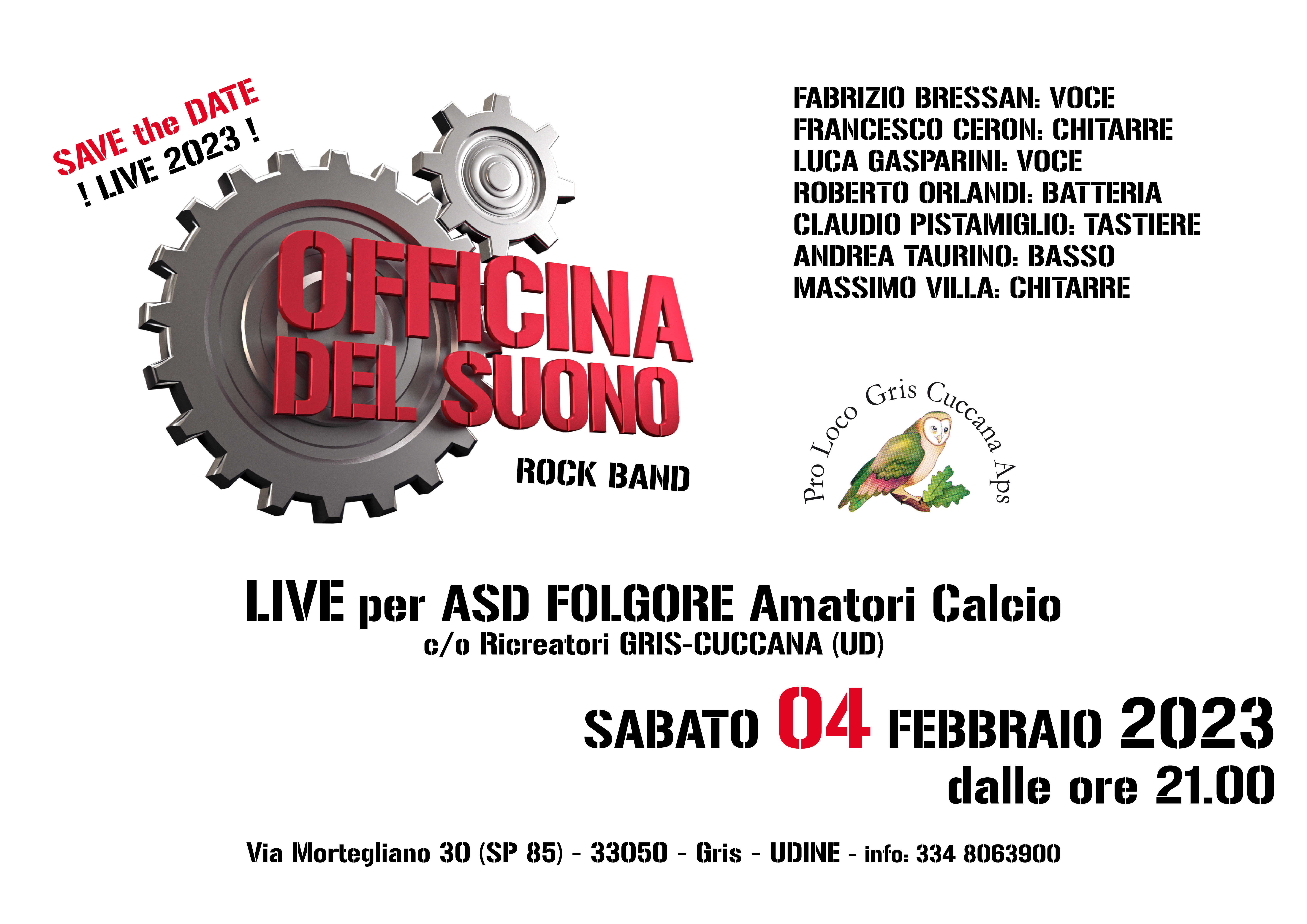 Sabato 04 Febbraio 2023 L'Officina Del Suono ritorna "live" per ASD FOLGORE Amatori Calcio c/o Ricreatori GRIS-CUCCANA (UD) Via Mortegliano 30 (SP 85) - 33050 - Gris - UDINE - info: 334 8063900