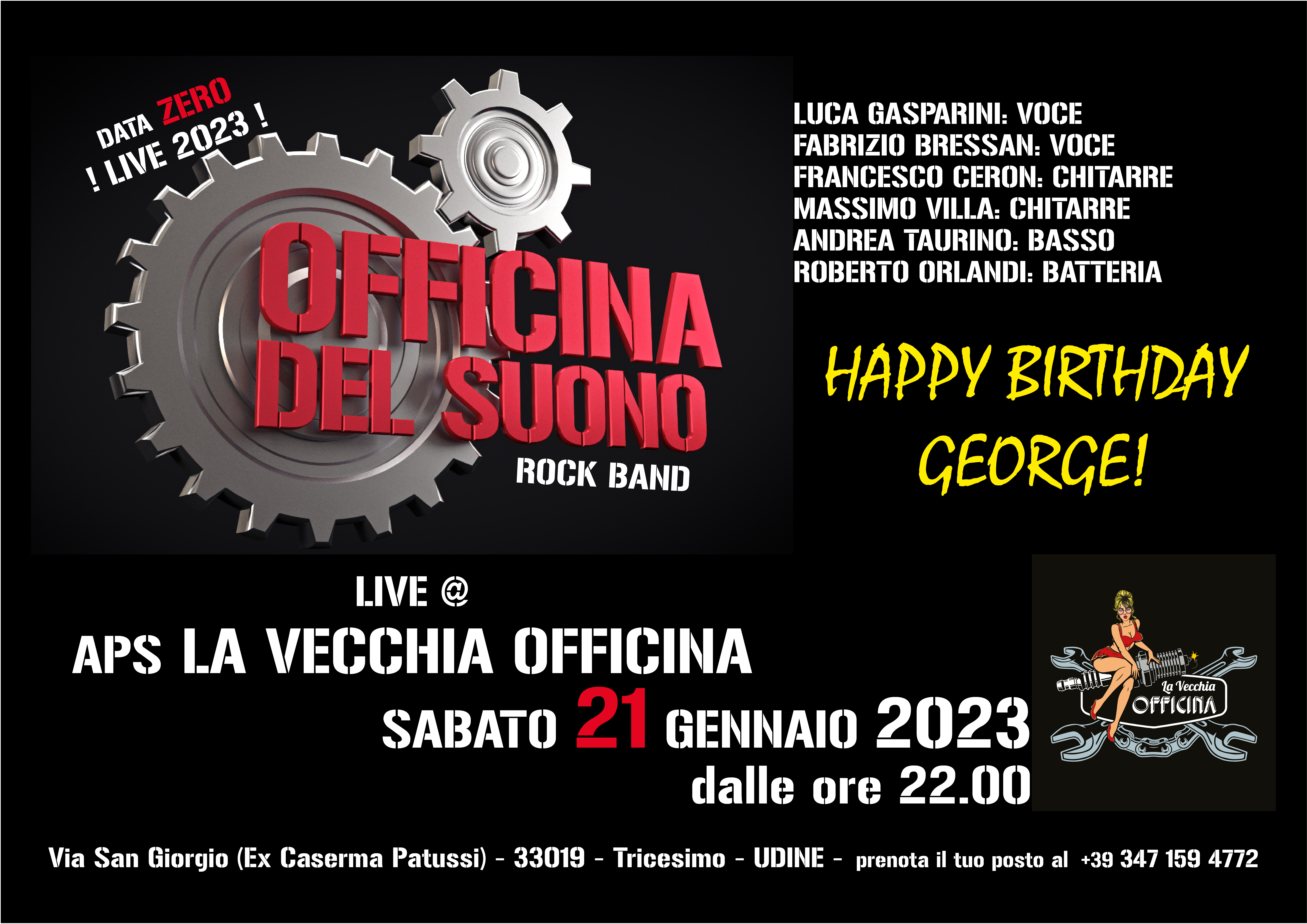 Il ritorno alle manifestazioni LIVE per Officina Del Suono. APS LA Vecchia Officina - Happy Birthday George - Dalle ore 22.00 Un'ora e fischia di classic_rock_Anni 80. Con la nuova formazione...Vi AspettiamoVia San Giorgio (Ex Caserma Patussi) - 33019 - Tricesimo - UDINE - prenota il tuo posto al +39 347 159 4772